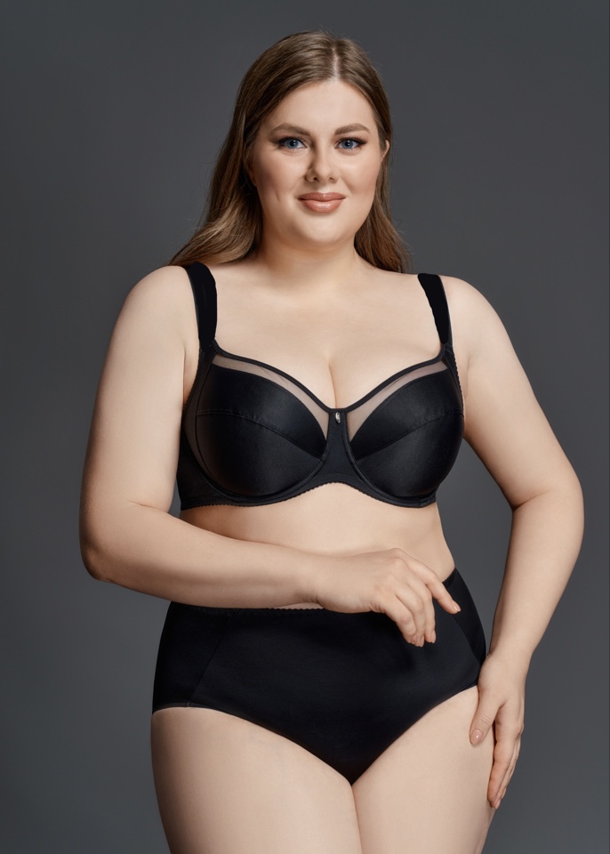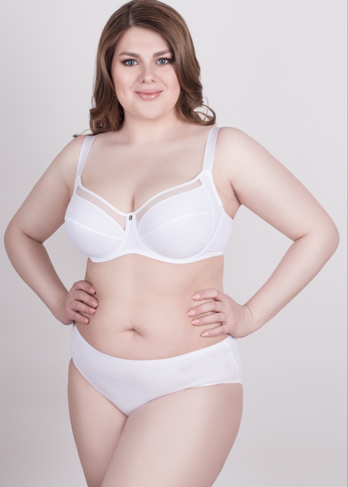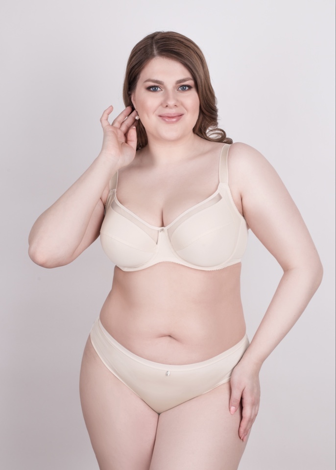 Бюстгальтер с мягкими чашками двойное членение и боковая корректирующая деталь. Расширенная бретель. Верхняя деталь чашки из неэластичного сетчатого полотна. Нижняя деталь чашки из неэластичного трикотажного полотна дополнительно ламинированна хлопком. Отделка — подвеска.