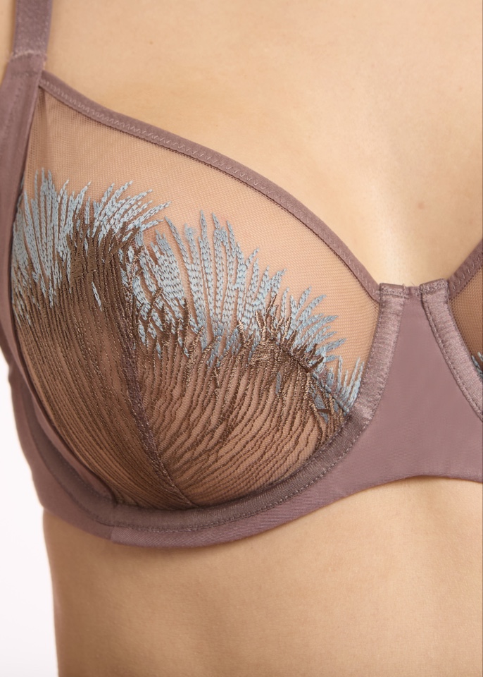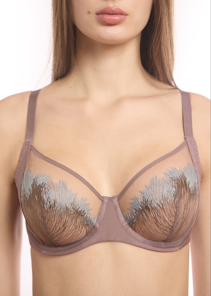 Бюстгальтер с мягкими чашками и боковой корректирующей деталью на каркасах . Стан бюстгальтера выполнен из трикотажного вискозного полотна на подкладе из эластичного сетчетого полотна.
