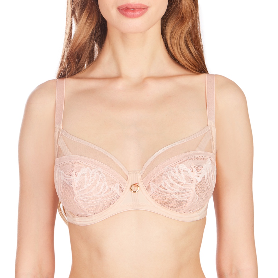 Бюстгальтер с мягкими чашками на каркасах придает груди красивую естественную форму без дополнительного объема и обеспечивает надежную поддержку. Боковая корректирующая деталь помогает собрать лишний объем из зоны подмышек, обеспечивая более гладкий и аккуратный силуэт. Это не только улучшает посадку изделия, но и придает уверенность в каждом движении. Бюстгальтер выполнен из выразительного кружева с цветочным рисунком и тонкого полупрозрачного сетчатого полотна. Завершенность образу добавляет стильный декор на ластовице в виде металлического кольца с кристаллом.